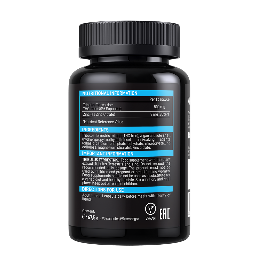 Ingredients: Tribulus Terrestris extract (THC free), vegan capsule shell (hydroxypropylmethylcellulose), anti-caking agents (dibasic calcium phosphate dehydrate, microcrystalline cellulose, magnesium stearate), zinc citrate.
